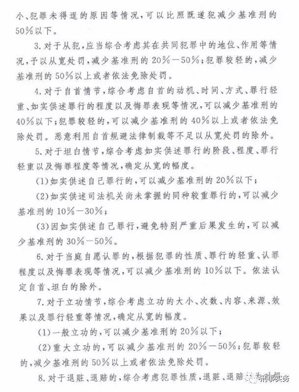 坦白 | 如实供述的减少20%以下;如实供述司法机关未掌握的同种罪行的减少10%-30%;如实供述避免严重后果发生的减少30%-50%。 | 来源“刑事实务”微信公众号 |